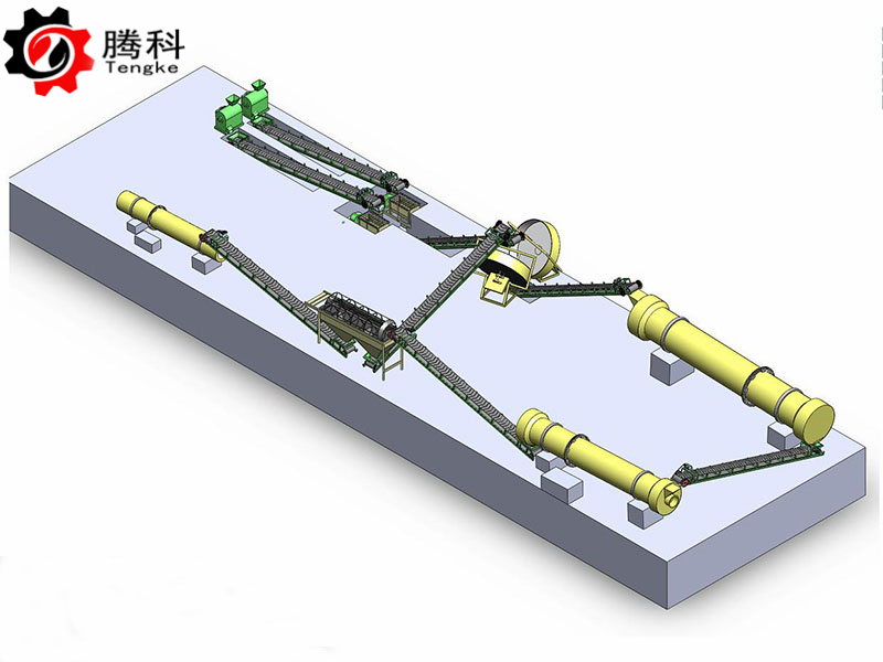 中配置:储料仓、半湿物料粉碎机、卧式搅拌机、造粒机、烘干机、冷却机、滚筒筛分机、包装设备、皮带输送机等。