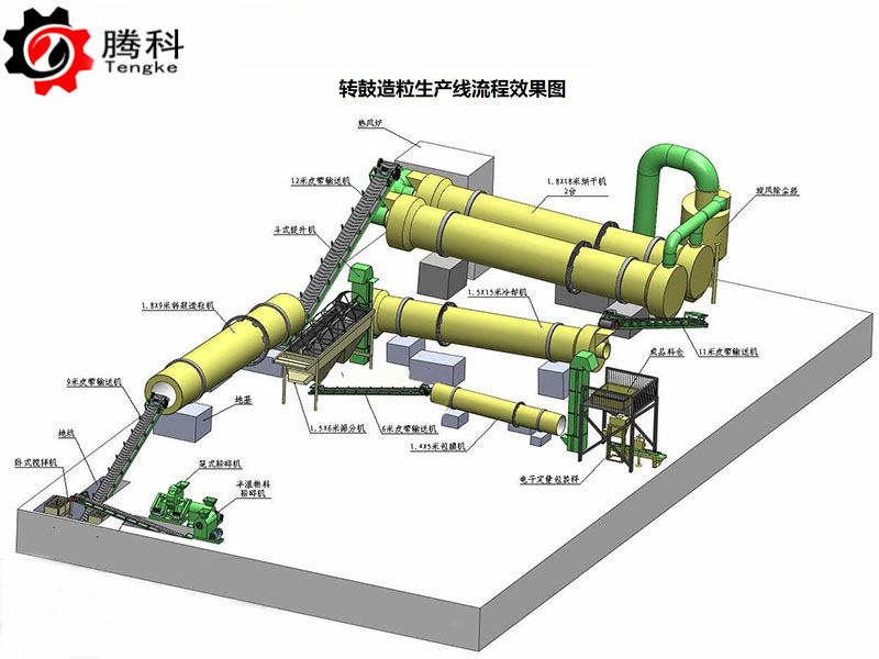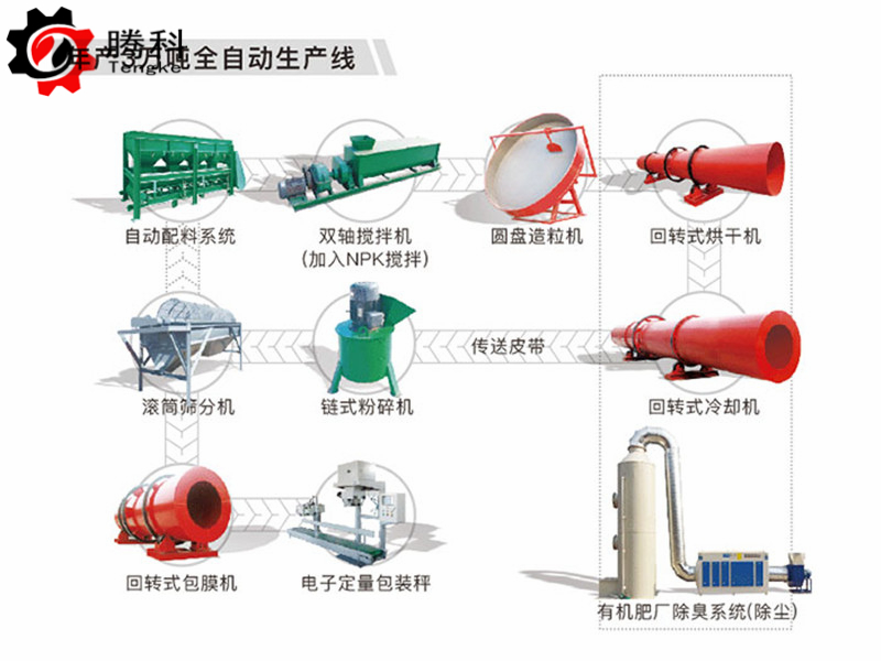 发酵设备——粉碎机——传送带——搅拌机——传送带——圆盘造粒机——传送带——烘干机——传送带——冷却机——传送带——筛分机——传送带——包膜机——提升机——包装秤